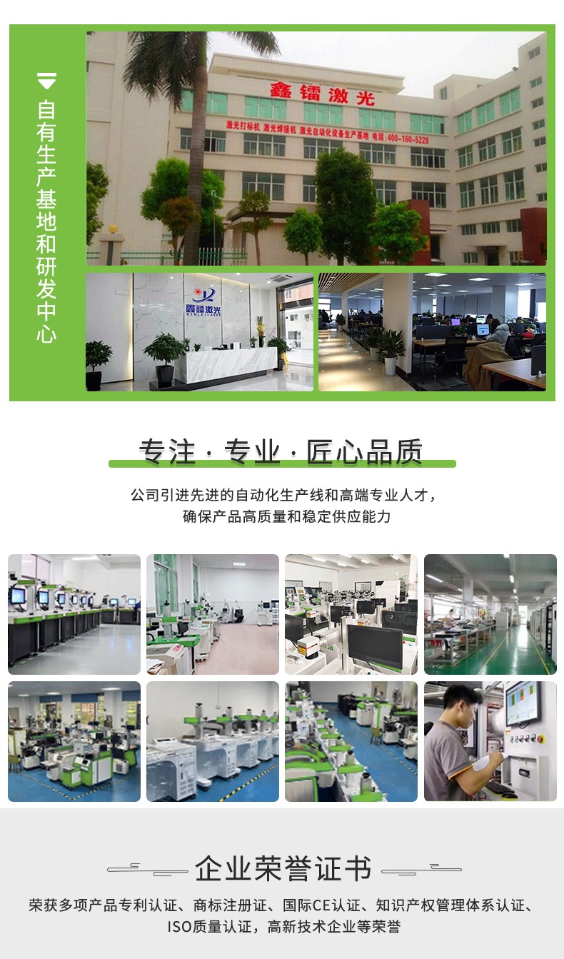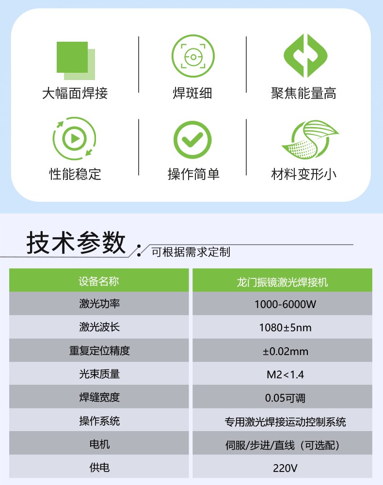 采用光纖連續激光器、龍門運動結構、高功率振鏡焊接頭、水冷系統、PC機控制系統等重要部件集成,具有高功率、精細光束質量、免維護、高電光轉換效率等特性,可進行點、直線、圓等任意平面幾何圖形軌跡焊接,是一款高效、安全、穩定的高功率光纖激光焊接機,在新能源電池焊接方面表現優異,可焊接各種規格型號的鋰電池組。
